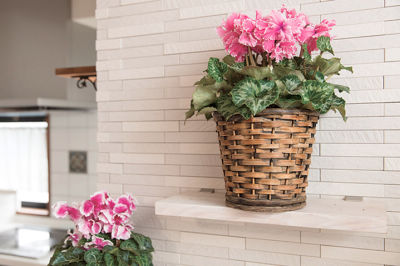 壁の一部に調湿タイルを張り、華やかな壁と小さな飾り棚でおしゃれに。