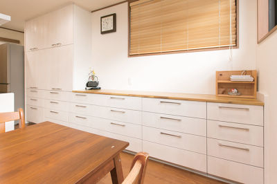大容量のカップボードは色々な物がたくさん入るので、家の中がすっきり。インテリアのアクセントにもなっていて、見た目の迫力や豪華さが来客にも好評です。