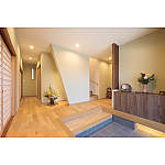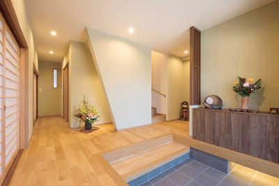 玄関は、無垢材の床、塗り壁など自然素材と階段下のアートスペースがお客様をお出迎え。