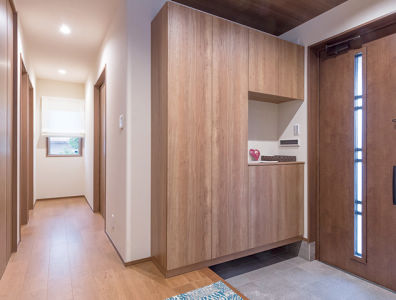 玄関は、入り口を変え、和風の趣を残しつつ生まれ変わりました。シュークローゼットとは別に物入れを設置し、収納に困らず快適に。