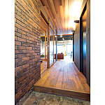 玄関は、レンガ調のタイル仕上げ。視線がリビングから抜けて開放感がでるように、フローリングの張る向きにもこだわりました。