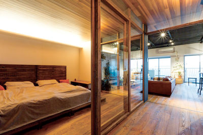 天井を一段下げてこもれる空間に仕上げたベッドルーム。木枠にガラスをはめ込んだパーテーションが、抜けのある開放感を演出します。
