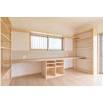 小学生のお子さん2人のための学習スペース。本棚とタモ集成材のカウンターは大工さんの手づくりで、木の味わいも魅力。