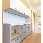 間取り的に難しかった対面キッチンは、廊下スペースにカップボードを設けることで奥様憧れの対面キッチンを実現。