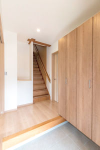 下駄箱を、天井まである大容量の玄関クローゼットに交換。正面にはニッチを設け、框は既存のものを磨いて利用。