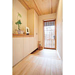玄関から風が通り抜けるよう格子網戸を設え、床には水に強く素材感が魅力のクリの木を使用。