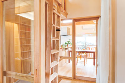 リビングへの扉にはガラスを使用。「透明なガラスで“抜け”をつくると広く見えます」。手前には、ロフトにつながる木製の梯子。ロフトはお孫さんたちの格好の遊び場。