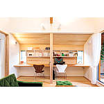 木の温かみに囲まれた、勾配天井で明るく開放的なキッチン。遠くの山々を望む“やまなみテラス”からリビングへ心地よい風が通り、コンパクトながら開放的な空間に。