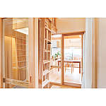 玄関に設えた格子網戸からは風が通り、1階の床と外壁、屋根の断熱材を使用し、夏は涼しく冬はあたたかい、地球にも体にもやさしい住まい。勾配を緩やかにし、昇り降りがラクになった階段を昇ると、光や風とともにテラスの植栽がお出迎え。天井や床に使用された杉やヒノキの天然素材も心地よく、省エネにも一役買っています。