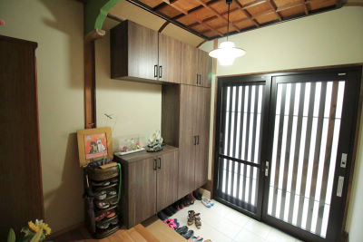 ご要望③ 6人でお住まいの内、女性(お孫さんも含め)4人と女性の割合が多く、靴が収納できないのと、玄関タイルのひび割れなどもあり、収納力のある、段差のすくない玄関廻りに。