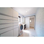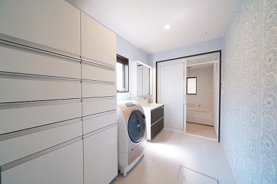 収納力抜群のウツクシーズ洗面ドレッシングとサイドキャビネットで、見た目もすっきりと片付きました。