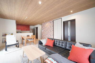 ご夫婦こだわりのLDKは、レンガ柄のアクセントクロスが印象的な、ブルックリン調。