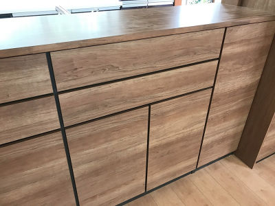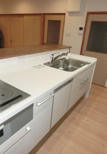 垂れ壁の吊り戸棚は背が高くて使いづらく、欲しい所に収納スペースがない。シンク横に食洗機を置いて使用していました。