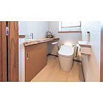 自動掃除機能でお手入れが楽になったトイレ。将来に備えてアームレストを設置。