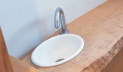 便利なセンサー水栓のあるカウンターは、厳選したカエデの無垢板を使用しました。