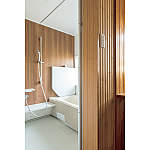 お孫さんのために出入り口を広げた浴室。壁の一部に、周囲と色が合い湿気にも強い「竹」を採用。