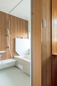 お孫さんのために出入り口を広げた浴室。壁の一部に、周囲と色が合い湿気にも強い「竹」を採用。