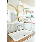 洗面所には貼りたいタイルの高さに合わせて水栓を採用。