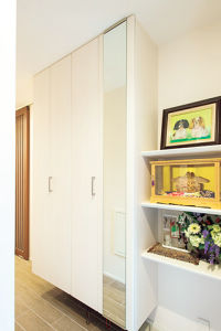 大型シューズボックスは、床から浮かせて圧迫感が出ないように。