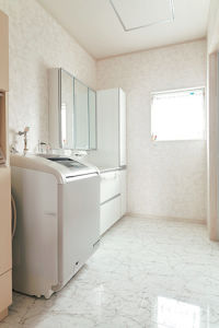 白を基調とした洗面所は、ラグジュアリー感のある洗面台で奥様お気に入りの空間に。