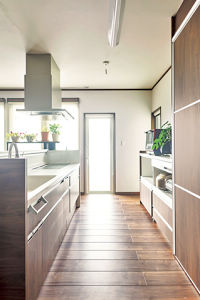 オープン型のカウンターキッチンは、収納力と使いやすさで大満足。ゆとりのある配置で家事動線を確保しています。