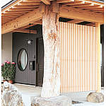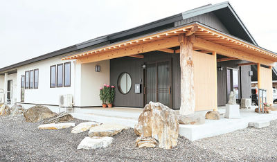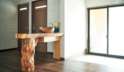 大広間にあった立派な床柱は、表玄関の象徴に。柱を支えている束石は、旧家で庭石として置かれていたもの。
