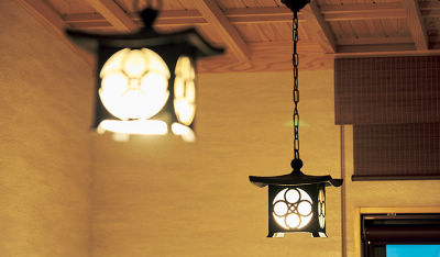 かつて2階の大広間で使用していた照明は、和の趣あるエントランスの空間を演出。