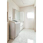 白を基調とした洗面所は、ラグジュアリー感のある洗面台で奥様お気に入りの空間に。
