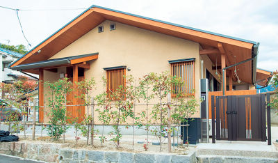 玄関の植栽とともに、歴史のある街になじむ色合いの外観。外壁は耐久性が高い「白洲そとん壁」を採用。