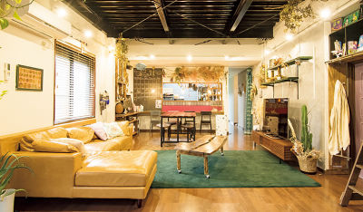「ガレージハウスが憧れ」というO様ご夫婦。カフェ兼事務所だった鉄骨2階建てをリノベーションし、自分たちで手を加えながら理想の住まいにアップデート。土間を上がれば、大空間LDK。家族の自由な時間が流れます。