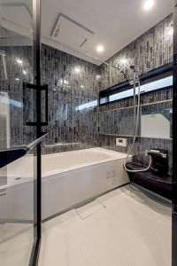 ガラスの扉とシックな色合いのモダンな浴室はご主人のお気に入り。