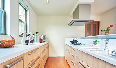 小柄な奥様に合わせて収納は低い位置に。食器も楽に出し入れ。