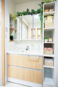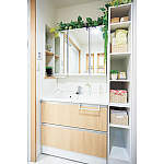 大きな三面鏡付きの洗面台は、シーラインを採用。奥行きがスリムで圧迫感がありません。