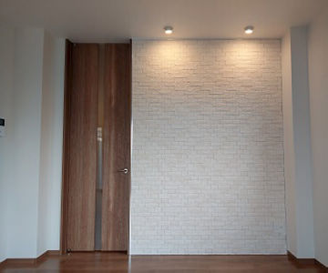 入口脇の壁は表面に凹凸のあるエコカラットを貼り、照明を当てて更に高級感を演出しています。