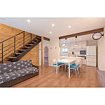 新設のスケルトン階段は踏板以外を黒にしたので、開放感がありながらもシャープな印象に。階段奥の壁一面を床のチェリー柄と合わせて、ご主人のご要望どおりのインテリアに仕上がりました。ご両親の住居との間には防音シートを入れて生活音に配慮。お子様たちが元気よく遊ぶ歓声も気兼ねなく見守れます。