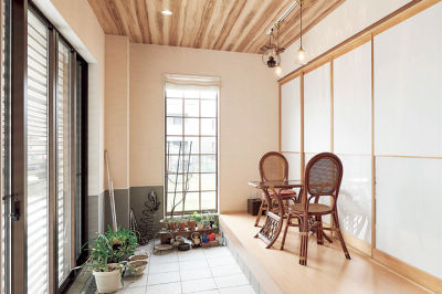 1階を居住空間にしたことで、大きな玄関を設けることができました。広い土間スペースには趣味のガーデニングが楽しめるインナーテラスを。