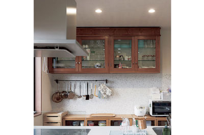 キッチン背面の収納は、N様の奥様のお父様が営んでいた喫茶店のキャビネットを再利用。