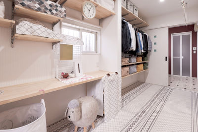 洗面室とリビングにつながる家事室。オープンクローゼットは家族ごとにスペースを。家事デスクに、肌がきれいに見える照明を設置。ゆっくりメイクができます。