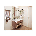 フロートプランの洗面台なら、床のお掃除もラク。壁面のタイルでグッとお洒落に。