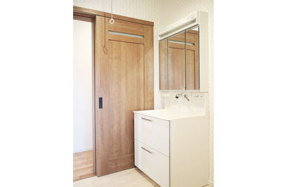 使いづらい場所にあった洗濯機を新洗面室へ。物干しスペースもあり、家事がラクになりました。