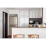 キッチンの雑多な部分は見えないように、手元を隠せるカウンターを造作でプラス。天井まで高さのある大容量のカップボードには、食器や調理機器をたっぷり収納できます。以前のキッチンに比べ収納が増え、すっきり片付けられるスマートなキッチンに仕上がりました。