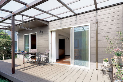 庭で過ごす時間も楽しみたいと親設したデッキ。窓を開けると、リビングとひと続き。