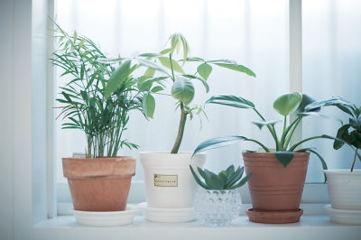 窓を1面に減らしても朝日が差し込む、明るい浴室。窓辺にはグリーンも。