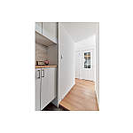 玄関収納の天板は無垢板。正面の納戸の扉は、採光窓のある白にし、明るい印象に。
