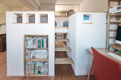 収納スペースの確保のためにご主人が考えられたのは、ロフトベッドでした。そこで、子供部屋と書斎をひとつにし、ご夫婦の寝室にもなる大きなロフトベッドをつくり上げました。たっぷりの収納スペースを確保しただけでなく、「床で寝るよりもあたたかく、視線も高くなって今まで見ていた窓の景色も変わり、新鮮な気分です」と奥様も快適性に満足されています。