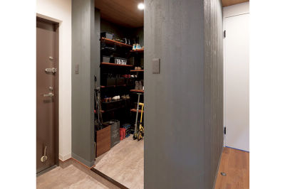 パントリーには食品のほかに、奥様がよく使われる文房具も収納。新設した足元の引き戸を開ければ玄関から直接、買い物をパントリーへ入れられます。