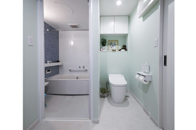 トイレにはドアを設けず、洗面所と一体化。開放感のある空間に。