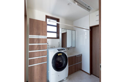 洗濯して、その場で室内干し。隣接の家事室クローゼットに、吊るして収納できて便利。
