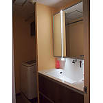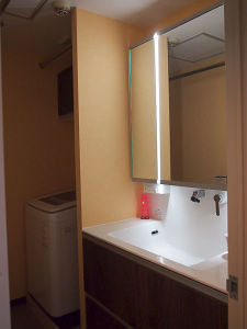 キッチンと洗面室には使用頻度の少ない引戸があった。壁にする事で洗面室が広く感じられる。手の届くところに 置いていた小物類・ドライヤーなどはウツクシーズのミラー裏に収納されたのでスッキリとした洗面室になった。