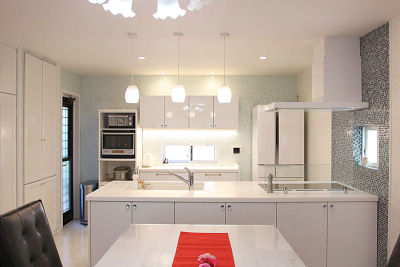 キッチン廻りの壁を壊し、フラット対面にしてたので、広々キッチン空間になりました。カップボード側の壁面はタイルを一面に貼り、採光でキッチン空間はキラキラ光っています。